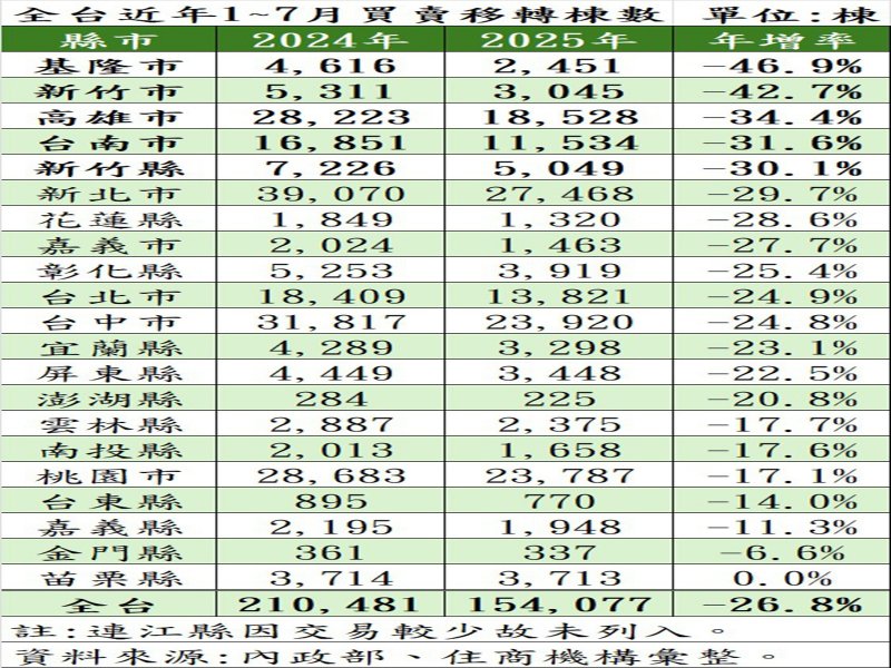 全台不動產市場進入寒冬,恐怕將重現2016~2017年時房市谷底。住商機構彙整內政部資料,全台1~7月買賣移轉棟數僅15.4萬棟,較去年同期減少26.8%。大家房屋企劃研究室公關主任賴志昶表示,全台縣市1~7月買氣與去年同期相比,皆有不同程度下滑,尤以過去房市熱區如新竹縣市、南二都等處跌幅最重,如下半年交易再縮,全台今年買賣移轉棟數恐面臨保26萬棟大關。