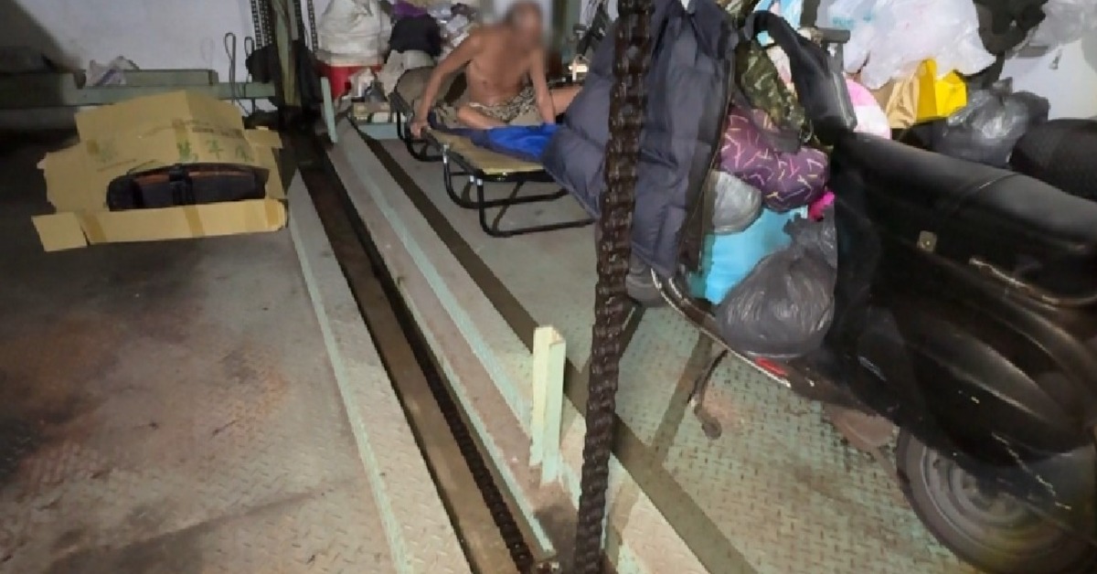 地下停車場最角落的這格機械車位,停的不是車,而是堆滿家當,躺椅、睡袋、板凳、電風扇等等,男子把這裡當成家,甚至大剌剌的插插頭用電,但其實這是別人的車位,男子也早已不是住戶。