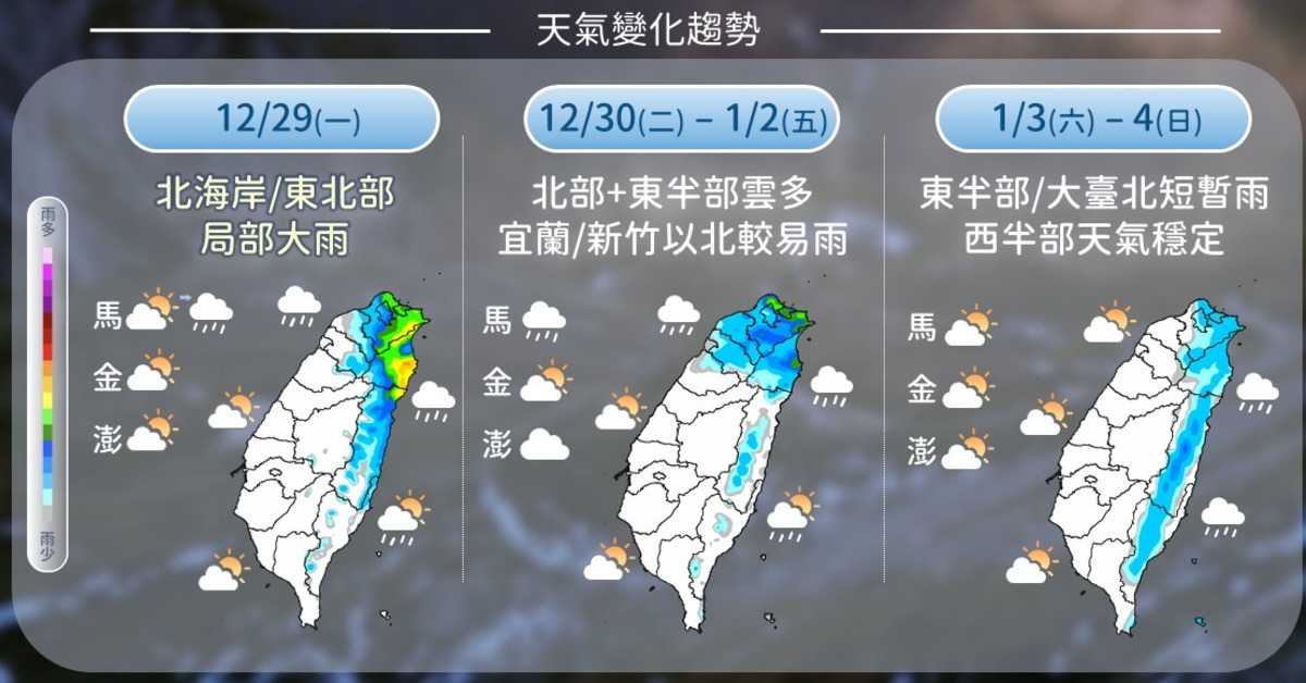 厚衣服又得拿出來了!中央氣象署指出,今(29)日各地氣溫短暫回升,但自明日起至元旦,東北季風逐漸增強,2日至3日將有冷氣團南下影響,各地氣溫將明顯下降。預估台南以北及宜蘭地區低溫普遍落在11至14度,局部地區不排除降至10度以下。