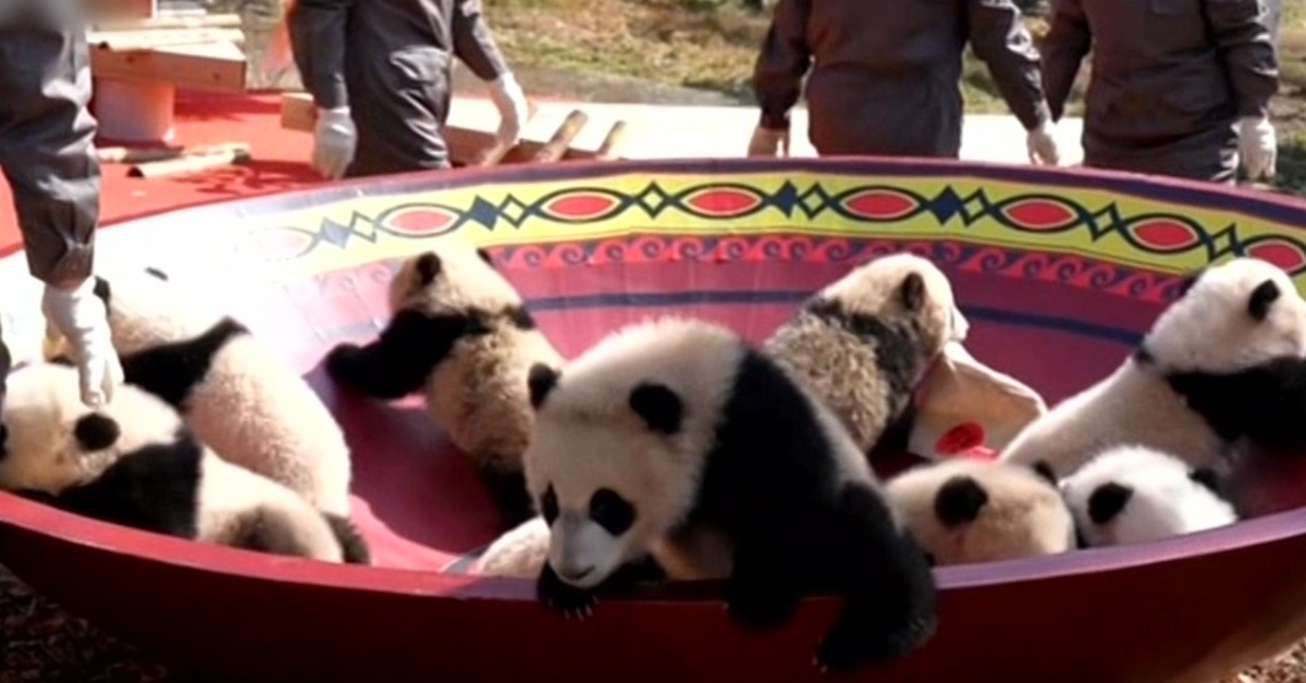 把小貓熊一口氣全部放進大碗裡,一隻隻毛茸茸圓滾滾的黑白小可愛,就像芝麻湯圓,又像是過年在玩的擲骰子「十八啦」,這群四川的小貓熊,都是去年2025年的新生報到,首次集體在鏡頭前亮相跟大家拜年,超級活潑又可愛,軟萌的樣子把觀眾都融化了。