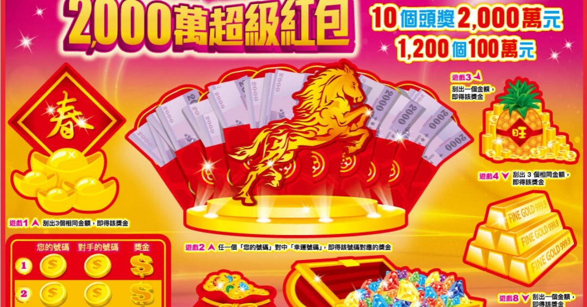 為搶攻春節買氣,台灣彩券於年前推出多款刮刮樂商品,共計15種款式,合計提供1,479個百萬元以上獎項,總獎金逾399億元。其中最高獎金為「2,000萬超級紅包」,共設有10個頭獎。日前首位頭獎得主已出爐,彩券由基隆一名移動型刮刮樂經銷商售出,銷售地點多集中在基隆夜市、廟口及菜市場等地。