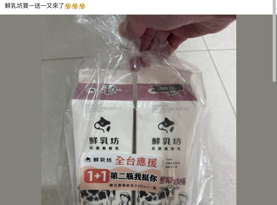 網友分享,鮮乳坊(豐樂牧場)悄悄推出「1+1 第二瓶我挺你」活動。(圖/翻攝自臉書「全聯消費經驗老實說中」)